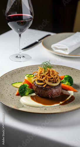 Filet Mignon Delight: Seared Steak with Crispy Onions, Vegetables & Wine. Exquisite Dining Experience!
