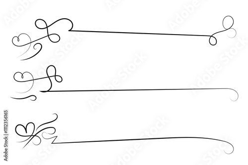 Filigree curly Calligraphic Heart, Fancy Line hearts divider and separator line Swirls, curve romantic love ornate, Valentine's Day flourish Swirl, Calligraphy lettering thin lines hearts scroll