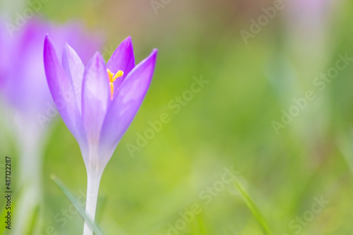 Filigree pink crocus flower blossoms in green grass are pollinated by flying insects like honey bees or flies in spring time as close-up macro with blurred background in garden landscape blooming wild