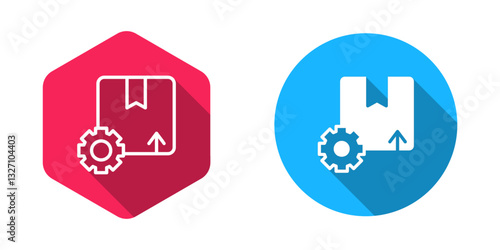 Filled and outline Gear wheel with package box icon isolated with long shadow background. Box, package, parcel sign. Delivery and packaging. Vector
