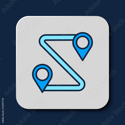 Filled outline Route location icon isolated on blue background. Map pointer sign. Concept of path or road. GPS navigator. Vector