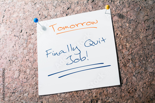Finally Quit Job Reminder For Tomorrow On Paper Pinned On Cork Board