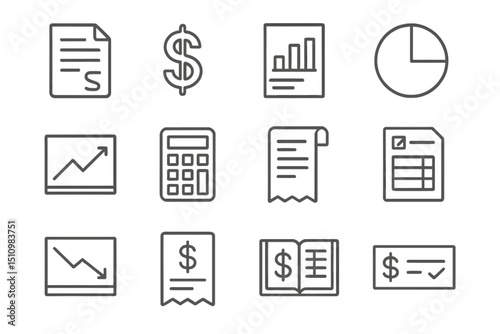 Finance and accounting icons: charts, documents, and calculator symbols