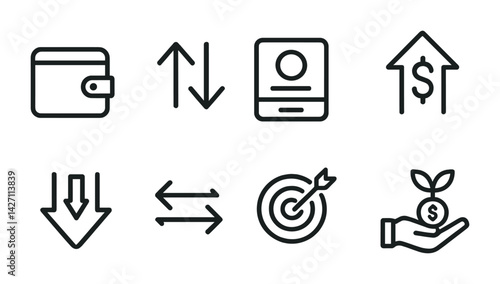 Finance and banking icon set – outline style money and transaction symbols for economic management, currency exchange, and financial analysis: wallet, transfer arrows, id card, dollar sign, arrow