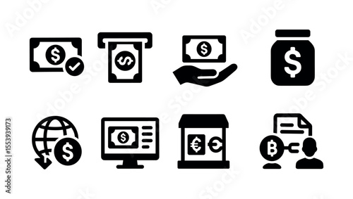 Finance and cryptocurrency solid icon set for banking and online transactions