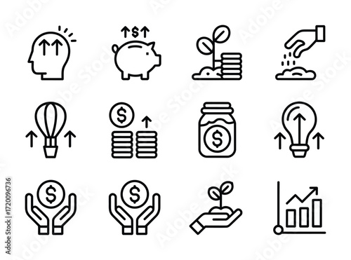 Finance and Investment Line Icons Set – Money Growth, Savings, Business Strategy