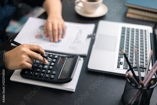 Finance bank tax expense accounting budget money businessman hand use calculator Financial calculate accountant close up calculator with graph chart write office desk Business expense analysis saving