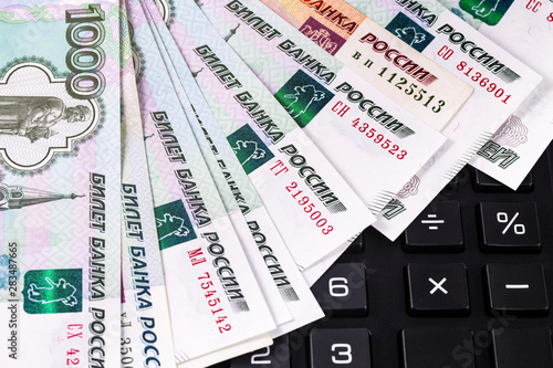 finance concept in closeup calculator on the Russian money, rubles banknotes background