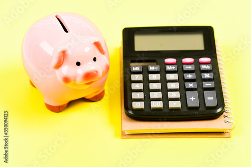 Finance department. Credit debt concept. Economics and finance. Piggy bank pink pig and calculator. Business administration. Calculate profit. Finance manager wanted. Trading exchange. Trade market