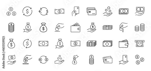 Finance line icon set. Vector pictograms of coins, banknotes, money bags, wallets, credit cards, mobile payments, and currency exchange, thin linear illustration.