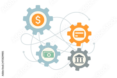 Finance mechanism with connected gears. Abstract vector illustration with integrated flat icons for money, credit card, and bank. Financial system and payment process concept.