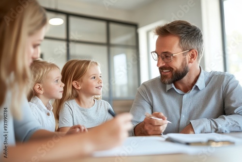 Financial Adviser Providing Insurance Guidance to Young Family in Bright Room - Side View