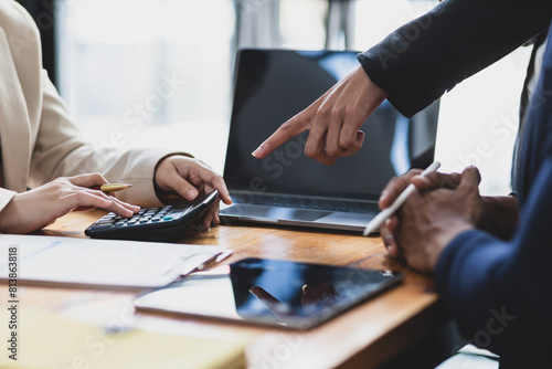 Financial advisor meeting is discussing data analysis, financial statistics, accounting and financial budget planning.