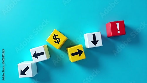 Financial Alert Colorful Cubes with Dollar Sign, Arrows, and Exclamation Mark on a Bright Blue Background