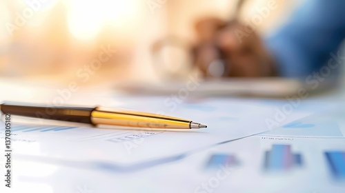 Financial Analysis, Close up of Pen on Charts, Gold pen on financial reports, business analysis concept