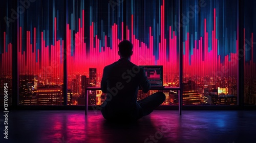 Financial Analyst Reviewing Gigapixel Data in High-Tech Office Urban Environment Night Viewpoint Data Visualization Concept