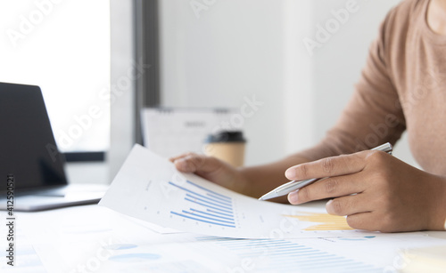 Financial businesswoman analyze the graph of the company's performance to create profits and growth, Market research reports and income statistics, Financial and Accounting concept.