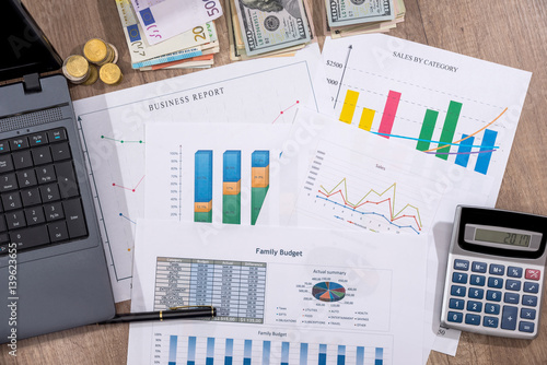 Financial charts, graphs, diagrams, financial report, computer and pen on wooden desk.