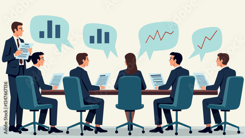 Financial Compliance Meeting Vector: Business Executives Reviewing Reports, Charts & Graphs for Risk Management, Integrity & Ethical Conduct at Conference Table.