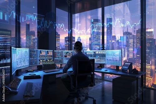 Financial Consultant Analyzing Stock Market Trends in Modern Office with Panoramic City View for Business Reports