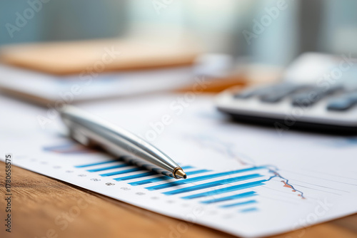 Financial distress documents with graphs, pen and calculator arranged, faceless bankruptcy petition, insolvency visualization detail, defocused office background, legal filing conc