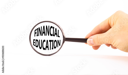 Financial education symbol. Concept words Financial education in beautiful magnifying glass. Beautiful white paper background. Businessman hand. Business Financial education concept. Copy space.