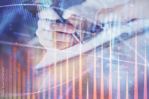 Financial forex graph displayed on hands taking notes background. Concept of research. Double exposure