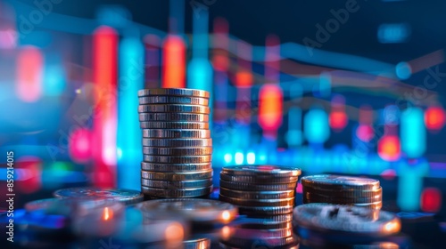 Financial Growth and Prosperity: Coins Against a Blurred Stock Chart Background