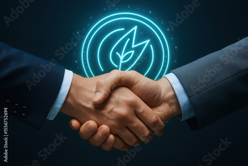Financial growth in energy sector represented by handshake between business partners with glowing eco leaf symbol in background