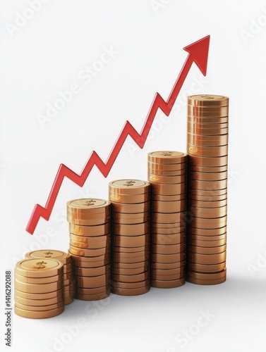 Financial growth visualized with stacked coins and upward-pointing arrow