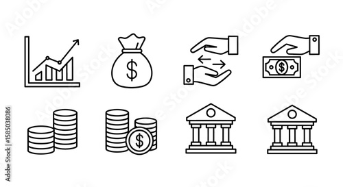 Financial Icon Set | Growth, money, bag, exchange, bank, investment, currency, building, coin, transfer, symbol, banking symbols icons