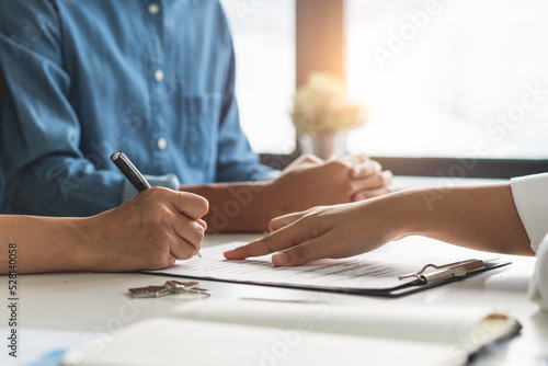 financial investor advisory. Close up hand pointing at contract and document while sitting together with young couple at the desk in office