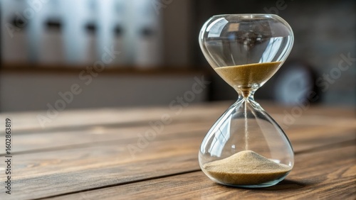Financial investor longterm concept. An elegant hourglass on a wooden table, symbolizing the passage of time.