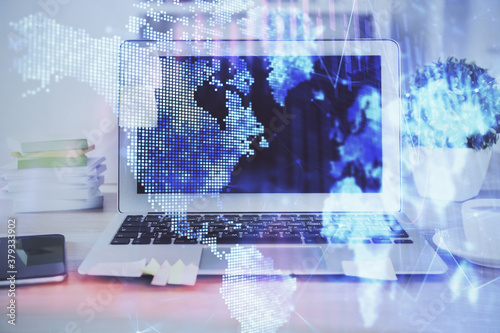 Financial market graph hologram and personal computer on background. Multi exposure. Concept of forex.