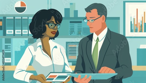 Financial Planner Presenting Growth Strategies on Tablet to Client in Detailed Illustration