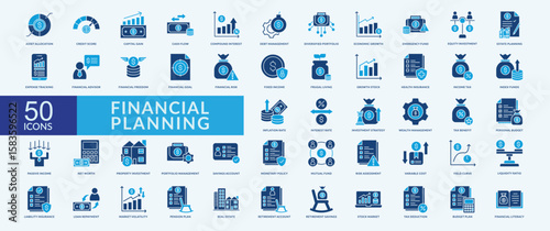Financial planning icon collection set with asset allocation, credit score, capital gain, equity investment