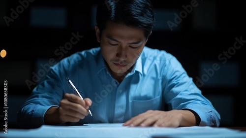 Financial Professional Analyzing Crisis Data with Spreadsheets in Dark Workspace