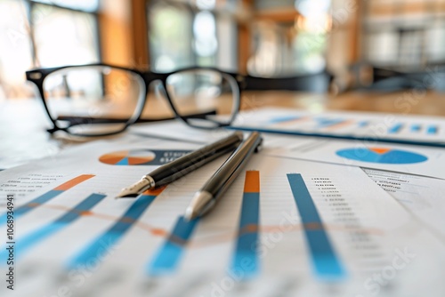 Financial reports display various graphs and data, accompanied by glasses and pens on the desk. Natural light illuminates the workspace, emphasizing the detailed analysis
