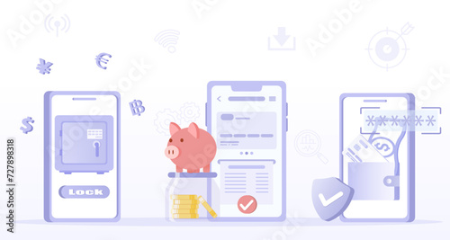 Financial technology concept. Collection of mobile application, internet banking, online payment, digital wallet, secure transaction, money transfer. Flat vector design illustration.