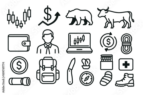 Financial trading and outdoor adventure icons with male profile