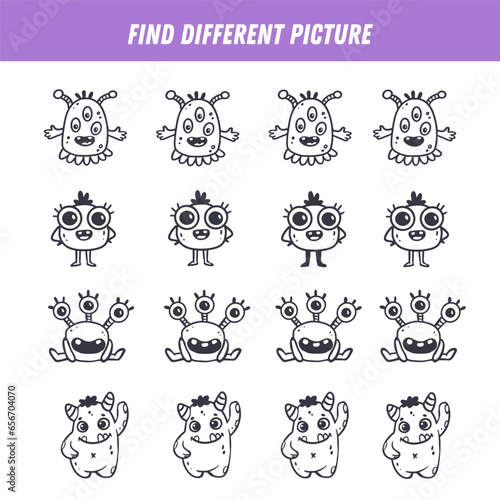 Find different monster in each row. Logical game for kids. Cartoon alien. Doodle. Vector coloring