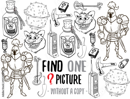Find one picture without a copy. Educational game for children with cartoon characters. Characters ready for colouring.