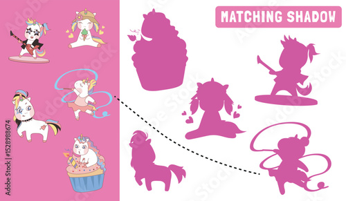 Find the correct shadow. Matching unicorn shadow game for children. Worksheet for kid. Educational printable worksheet