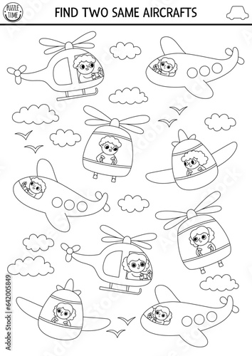 Find two same aircrafts. Transportation black and white matching activity for children. Air transport educational line quiz worksheet for kids. Coloring page with cute plane, helicopter.