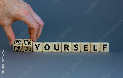 Finding or creating yourself symbol. Businessman turns wooden cubes and changes words Finding yourself to Creating yourself. Beautiful grey background, copy space. Business creating yourself concept.