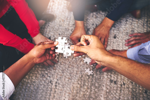 Finding solutions piece by piece. Shot of a group of unidentifiable businesspeople building a puzzle together.