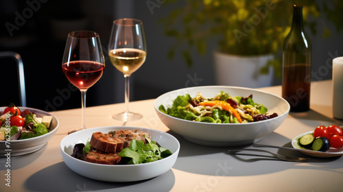 Fine restaurant dinner table place setting: napkin, wineglass, plate, bread and salad.