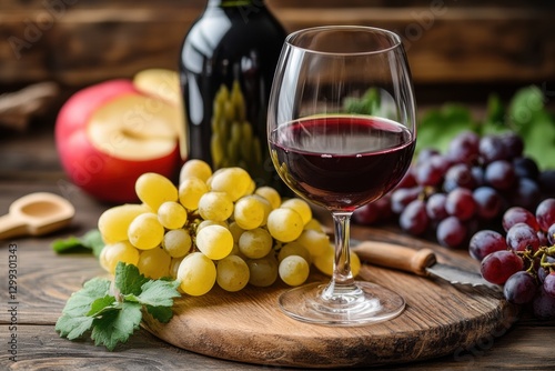 Fine wine served with fresh fruits on a wooden table in a rustic setting