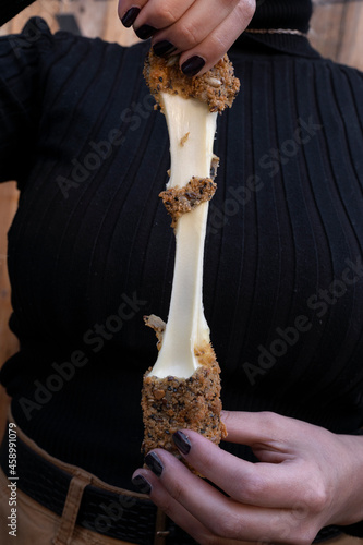 Finger food. Woman stretching fried mozzarella cheese sticks.