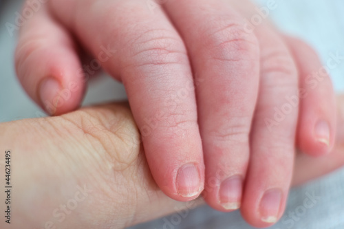 Finger on the hand of an adult and fingers on the hand of a newborn baby, macro photo